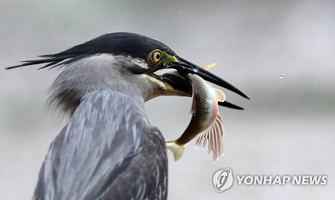 (강릉=연합뉴스) 유형재 기자 = 29일 강원 강릉시 남대천에서 검은댕기해오라기가 물고기를 사냥하고 있다. 2022.6.29