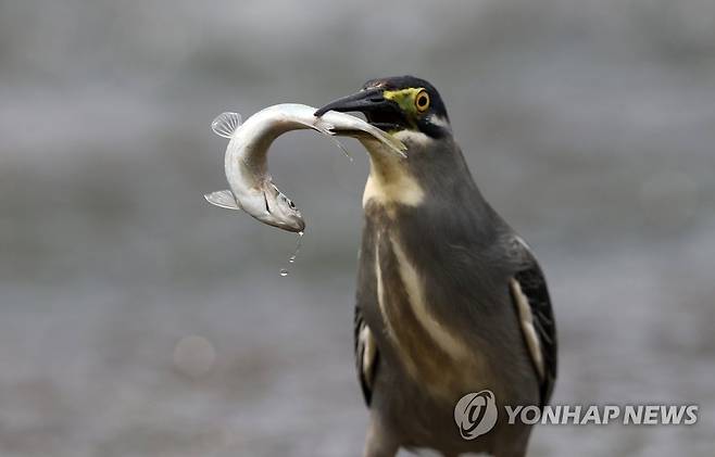 (강릉=연합뉴스) 유형재 기자 = 29일 강원 강릉시 남대천에서 검은댕기해오라기가 물고기를 사냥하고 있다. 2022.6.29