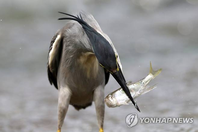 (강릉=연합뉴스) 유형재 기자 = 29일 강원 강릉시 남대천에서 검은댕기해오라기가 물고기를 사냥하고 있다. 2022.6.29