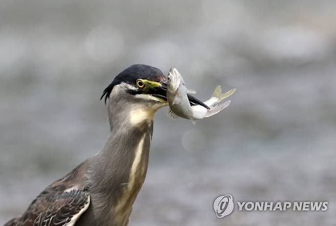 (강릉=연합뉴스) 유형재 기자 = 29일 강원 강릉시 남대천에서 검은댕기해오라기가 물고기를 사냥하고 있다. 2022.6.29