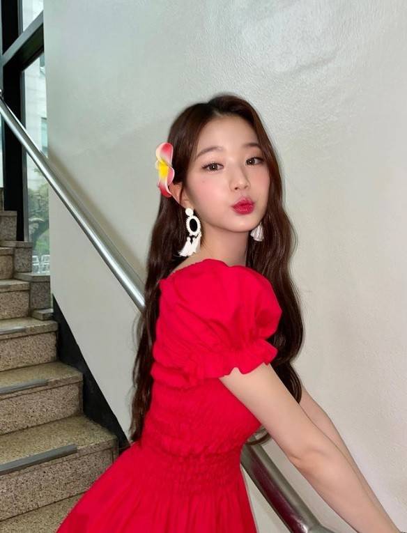 공개된 사진엔 계단에서 포즈를 취한 장원영의 모습이 담겼다. 레드 원피스 차림의 장원영은 넘치는 과즙미로 걸그룹 센터의 위용을 뽐냈다. 기다란 일자 각선미와 8등신 비율로 감탄도 자아냈다.