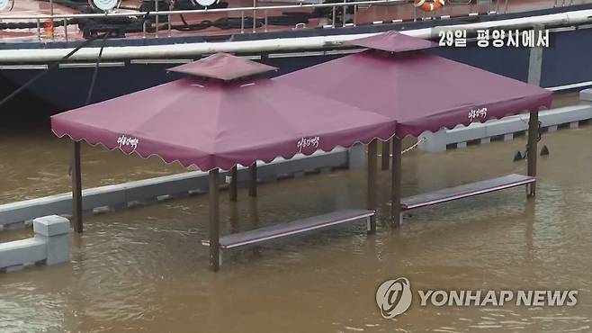 (서울=연합뉴스) 북한 조선중앙TV는 29일 집중호우로 대동강의 수위가 경고 기준을 넘어섰다며 유보도와 시설 등이 침수된 영상 등을 공개했다. [조선중앙TV 화면] 2022.6.29