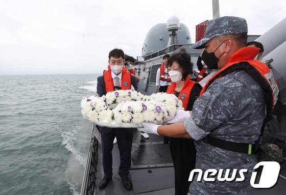 (평택=뉴스1) 김영운 기자 = 제2연평해전 승전 20주년 기념식이 열린 29일 오후 경기도 서해 해상에서 고(故) 윤영하 소령의 동생 윤영민 씨와 어머니 황덕희 씨가 유도탄고속함(PKG) '윤영하함'에서 해상 헌화를 하고 있다. 2022.6.29/뉴스1