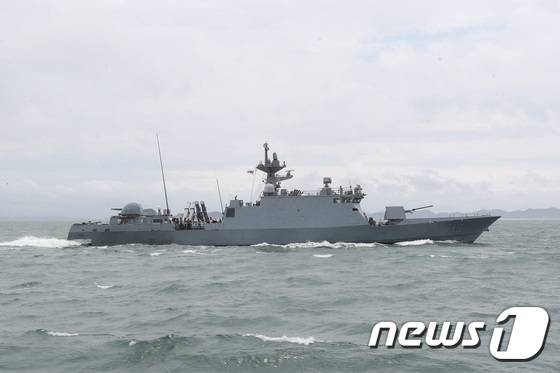 (평택=뉴스1) 김영운 기자 = 제2연평해전 승전 20주년 기념식이 열린 29일 오후 경기도 서해 해상에서 제2연평해전 유가족과 참전장병들이 승선한 '조천형함'이 해상 헌화 장소로 이동하고 있다. 2022.6.29/뉴스1