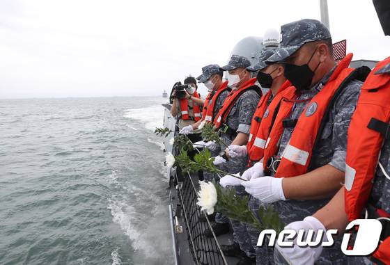 (평택=뉴스1) 김영운 기자 = 제2연평해전 승전 20주년 기념식이 열린 29일 오후 경기도 서해 해상에서 윤영하함 승조원들이 유도탄고속함(PKG) '윤영하함'을 타고 해상 헌화를 하고 있다. 2022.6.29/뉴스1