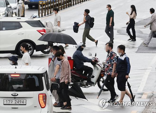 (서울=연합뉴스) 한종찬 기자 = 비가 내린 29일 오후 서울 교대역 인근에서 일부 시민들이 우산을 손에 들고 길을 건너고 있다. 2022.6.29