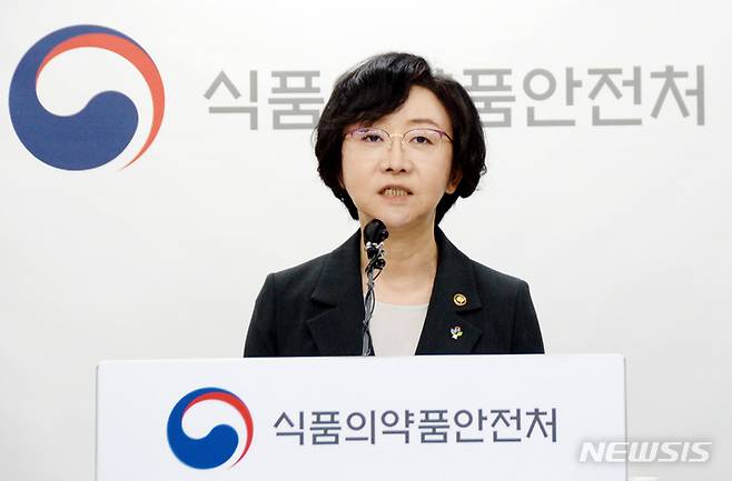 [청주=뉴시스] 조성현 기자 = SK바이오사이언스 코로나19 백신 최종점검 회의를 마친 오유경 식품의약품안전처장이 29일 오후 충북 청주시 오송읍 식품의약품안전처에서 국산 1호 코로나19 백신 '스카이코비원(GBP510)'의 품목 허가와 관련해 발언하고 있다. 2022.06.29. jsh0128@newsis.com