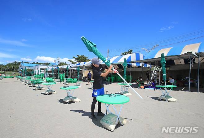 [제주=뉴시스] 우장호 기자 = 장마전선이 소강상태를 보이는 29일 오후 제주시 이호해변에서 해수욕장 개장 준비가 한창이다. 이호와 협재, 함덕 등 제주 도내 12개 해수욕장은 7월1일 일제히 문을 열고 피서객을 맞이 한다. 2022.06.29. woo1223@newsis.com