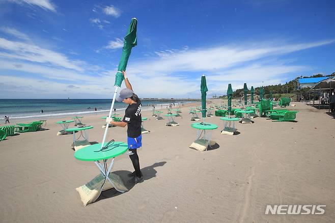 [제주=뉴시스] 우장호 기자 = 장마전선이 소강상태를 보이는 29일 오후 제주시 이호해변에서 해수욕장 개장 준비가 한창이다. 이호와 협재, 함덕 등 제주 도내 12개 해수욕장은 7월1일 일제히 문을 열고 피서객을 맞이 한다. 2022.06.29. woo1223@newsis.com