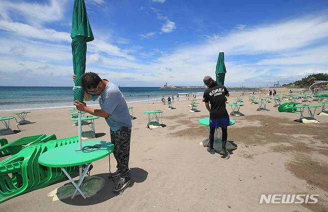 [제주=뉴시스] 우장호 기자 = 장마전선이 소강상태를 보이는 29일 오후 제주시 이호해변에서 해수욕장 개장 준비가 한창이다. 이호와 협재, 함덕 등 제주 도내 12개 해수욕장은 7월1일 일제히 문을 열고 피서객을 맞이 한다. 2022.06.29. woo1223@newsis.com