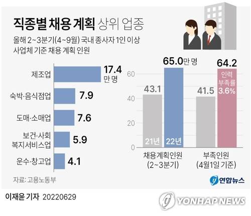고용노동부가 29일 발표한 올해 상반기 직종별 사업체 노동력 조사 결과에 따르면 국내 종사자 1인 이상 사업체의 올해 2∼3분기(4∼9월) 채용 계획 인원은 65만명으로, 작년 동기보다 21만9천명(50.8%) 증가했다.