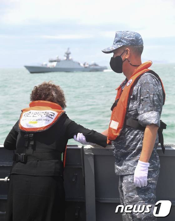 (평택=뉴스1) 김영운 기자 = 제2연평해전 승전 20주년 기념식이 열린 29일 오후 유가족이 경기도 서해 해상에서 조천형함을 타고 바다를 바라보며 슬퍼하고 있다. (공동취재) 2022.6.29/뉴스1