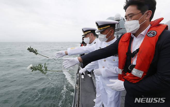 [평택=뉴시스] 김종택기자 = 제2연평해전 승전 20주년 기념식이 열린 29일 오후 경기도 서해상에서 제2연평해전 참전장병들이 유도탄고속함(PKG) '윤영하함'을 타고 해상 헌화를 하고 있다. 2022.06.29. jtk@newsis.com