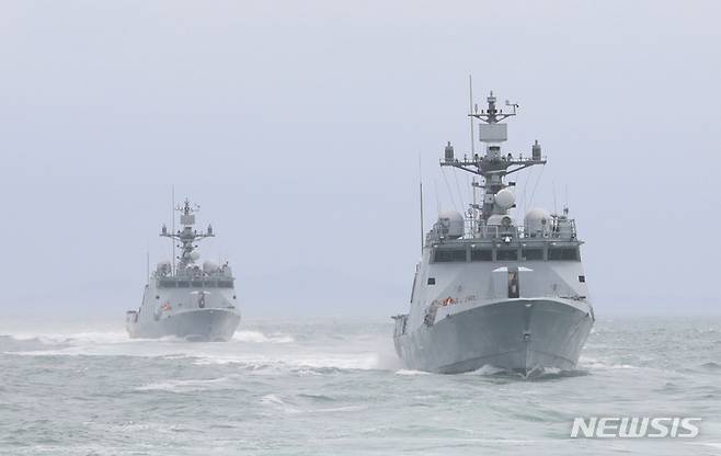 [평택=뉴시스] 김종택기자 = 제2연평해전 승전 20주년 기념식이 열린 29일 오후 경기도 서해상에서 제2연평해전 유가족과 참전장병들이 승선한 '서후원함'과 '박동혁함'이 해상 헌화 장소로 이동하고 있다. 2022.06.29. jtk@newsis.com