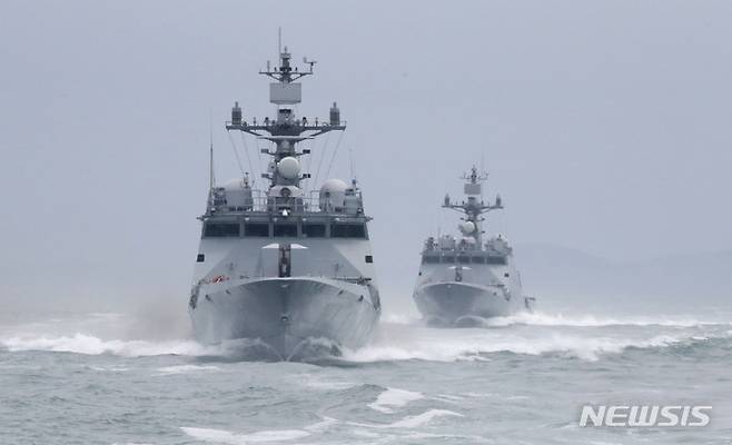 [평택=뉴시스] 김종택기자 = 제2연평해전 승전 20주년 기념식이 열린 29일 오후 경기도 서해상에서 제2연평해전 유가족과 참전장병들이 승선한 '서후원함'과 '박동혁함'이 해상 헌화 장소로 이동하고 있다. 2022.06.29. jtk@newsis.com