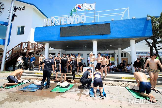 [제주=뉴시스] 우장호 기자 = 제주 도내 해수욕장 개장을 이틀 앞둔 29일 오후 제주시 이호해수욕장에서 수상안전요원 교육이 진행되고 있다. 제주도는 거리두기 해제로 피서객이 지난해보다 많이 찾을 것으로 예상, 안전요원 및 장비를 지난해보다 늘려 운용할 계획이다. 2022.06.29. woo1223@newsis.com