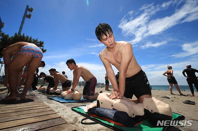 [제주=뉴시스] 우장호 기자 = 제주 도내 해수욕장 개장을 이틀 앞둔 29일 오후 제주시 이호해수욕장에서 수상안전요원 교육이 진행되고 있다. 제주도는 거리두기 해제로 피서객이 지난해보다 많이 찾을 것으로 예상, 안전요원 및 장비를 지난해보다 늘려 운용할 계획이다. 2022.06.29. woo1223@newsis.com