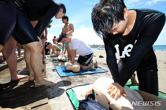 [제주=뉴시스] 우장호 기자 = 제주 도내 해수욕장 개장을 이틀 앞둔 29일 오후 제주시 이호해수욕장에서 수상안전요원 교육이 진행되고 있다. 제주도는 거리두기 해제로 피서객이 지난해보다 많이 찾을 것으로 예상, 안전요원 및 장비를 지난해보다 늘려 운용할 계획이다. 2022.06.29. woo1223@newsis.com