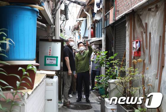 (서울=뉴스1) 신웅수 기자 = 오세훈 서울시장이 29일 오후 서울 종로구 돈의동 쪽방촌을 찾아 폭염 대책을 점검하고 있다.