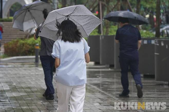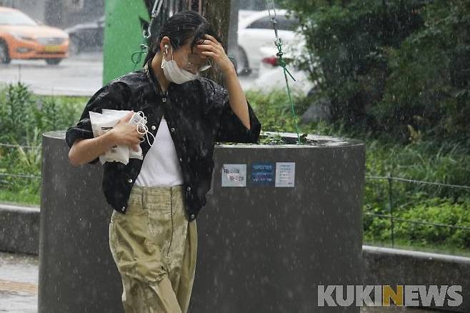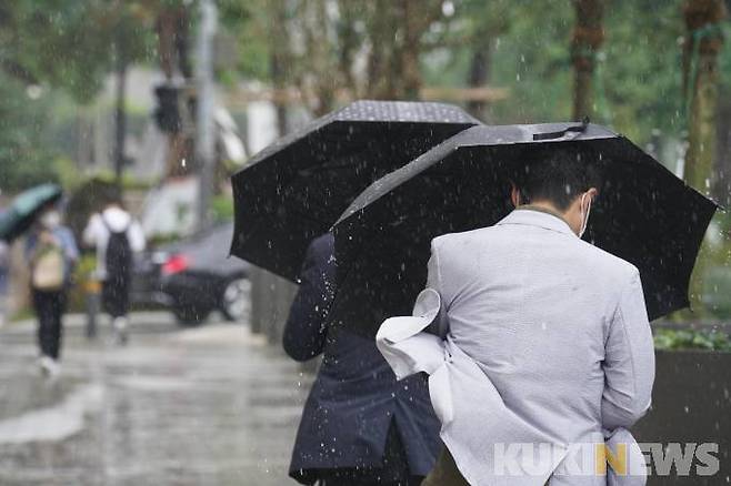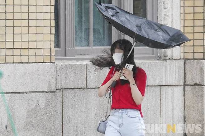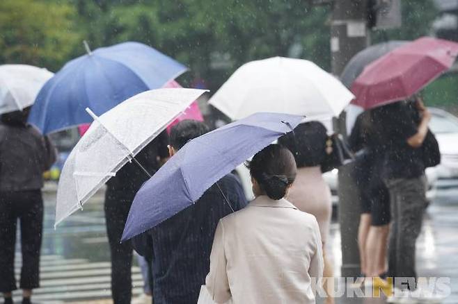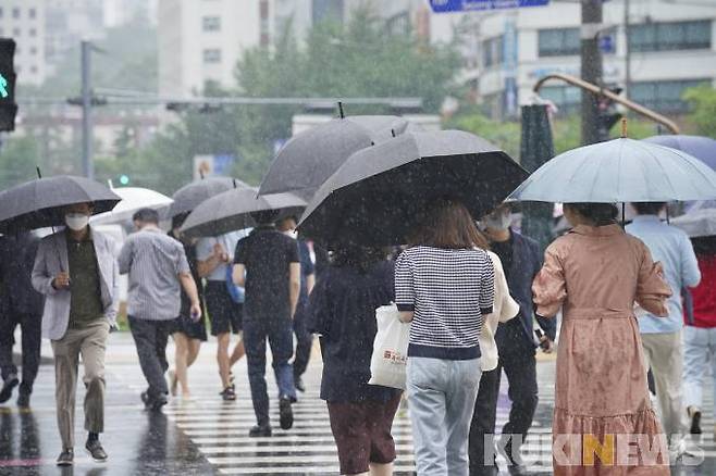 전국적으로 장마가 이어지고 있는 29일 오전 서울 중구 세종로 인근거리에서 우산을 쓴 시민들이 비바람을 맞으며 발걸음을 재촉하고 있다.