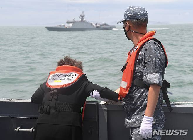 [평택=뉴시스] 김종택기자 = 제2연평해전 승전 20주년 기념식이 열린 29일 오후 경기도 서해상에서 유가족이 유도탄고속함(PKG) '조천형함'을 타고 해상 헌화를 마친 뒤 슬퍼하고 있다. 2022.06.29. jtk@newsis.com