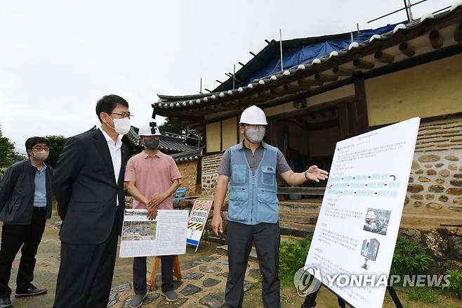 (서울=연합뉴스) 최응천 문화재청장(앞줄 왼쪽)이 29일 오전 국가민속문화재 논산 명재고택(論山 明齋古宅)의 안채 보수 현장을 방문해 현장 관계자로부터 현황설명을 듣고 있다. 2022.6.29 [문화재청 제공. 재판매 및 DB 금지]