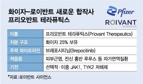 화이자와 로이반트는 새로운 자가면역질환 치료제를 개발·상용화하기 위해 '프리오반트 테라퓨틱스'(Priovant Therapeutics)를 설립했다고 28일(현지 시각) 발표했다. 화이자는 프리오반트에 경구·국소 제제 후보물질 브레포시티닙(Brepocitinib)의 글로벌 개발권과 미국과 일본에서의 상업화 권리를 이전했다. 그 대가로 화이자는 프리오반트 지분 25%를 보유했다.