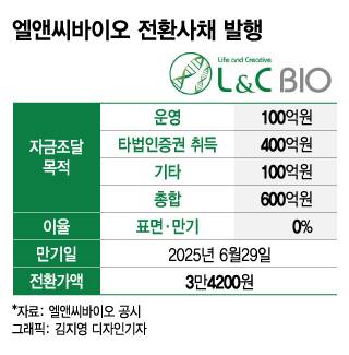 29일 금융감독원 전자공시시스템에 따르면 엘앤씨바이오는 이날 어센트-메리츠 신기술금융조합 제1호를 대상으로 3년 만기 600억원 규모 CB를 발행하기로 했다. 표면 이자율, 만기 이자율은 모두 0%다. 전환가액도 3만4200원으로 CB 발행이 결정된 28일 종가(3만3000원)보다 높다. 금융권 한 관계자는 "이론상 이자 0%는 발행사에 유리한 조건"이라며 "투자자는 중간에 이자를 받는 것보다 주식으로 전환한 후를 긍정적으로 보는 것"이라고 했다. 엘앤씨바이오 관계자도 "회사에 대한 자신감"이라고 했다.
