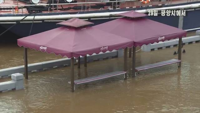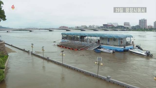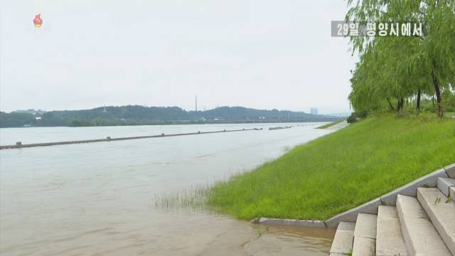 조선중앙TV는 29일 "보통강 유역에서 6월 27일 19시부터 29일 5시까지 233.7㎜의 많은 비가 내렸다"며 "29일 5시 현재 보통강 수문 관측소에서 수위는 5.57㎜로써 위험수위 5.46m를 초과한 상태"라고 밝혔다.