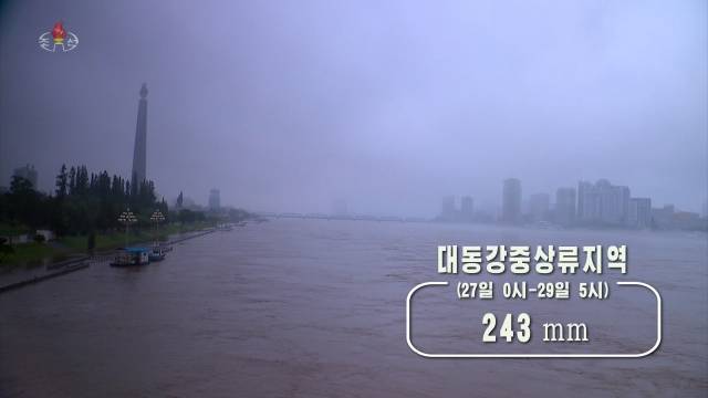 또 “27일 0시부터 29일 5시까지 대동강 유역 중상류 지역에 평균 243㎜의 많은 비가 내렸다”며 “29일 5시 현재 대동강의 대동강 다리 지점수위는 6.98m”라고 전했다.