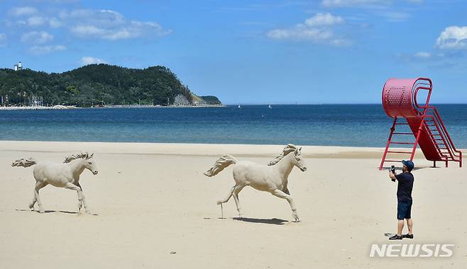 [포항=뉴시스] 이무열 기자 = 29일 오후 경북 포항시 북구 영일대해수욕장 백사장에 다양한 동물 모래조각 작품이 설치되어 있다. 2022.06.29. lmy@newsis.com