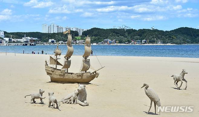 [포항=뉴시스] 이무열 기자 = 29일 오후 경북 포항시 북구 영일대해수욕장 백사장에 다양한 동물 모래조각 작품이 설치되어 있다. 2022.06.29. lmy@newsis.com