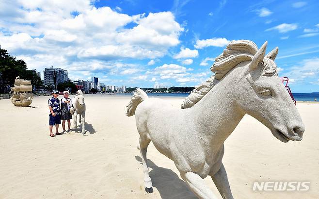 [포항=뉴시스] 이무열 기자 = 29일 오후 경북 포항시 북구 영일대해수욕장 백사장에 다양한 동물 모래조각 작품이 설치되어 있다. 2022.06.29. lmy@newsis.com