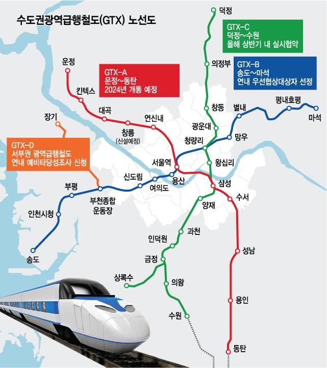 현재 A~C 노선은 기존 방안대로 추진 중이다. A 노선의 경우 파주 운정역~삼성역(민자구간)은 2024년 6월, 삼성역~동탄역(재정구간)은 2023년 12월 준공 목표다. B 노선은 최근 재정·민자 구간 기본계획을 확정했다. 연내 우선협상대상자를 선정, 2024년 실시계획 승인·착공을 거쳐 2030년께 개통될 것으로 예상된다. C 노선은 우선협상대상자와 올해 실시협약 체결을 목표로 협상 중이다.