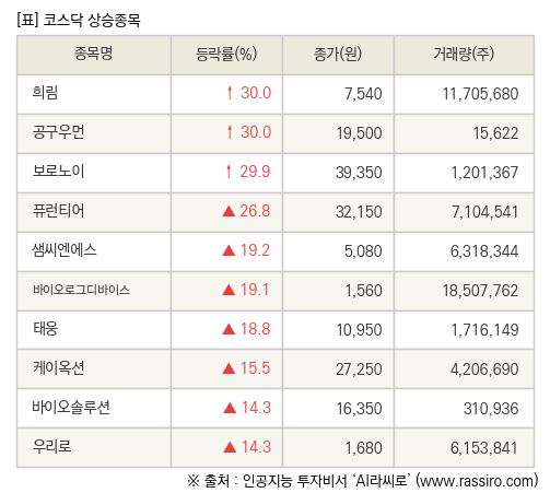 [fnRASSI]장마감, 코스닥 상승 종목(희림 30.0% ↑)