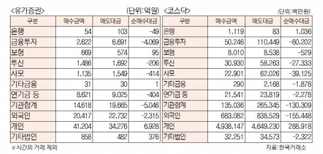[표]유가증권·코스닥 투자주체별 매매동향(6월 29일)
