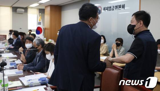 (세종=뉴스1) 김기남 기자 = 29일 오후 정부세종청사 최저임금위원회 회의실에서 속개된 제8차 전원회의에 앞서 정문주 근로자위원(오른쪽)이 특별위원들과 이야기를 나누고 있다.2022.6.29/뉴스1