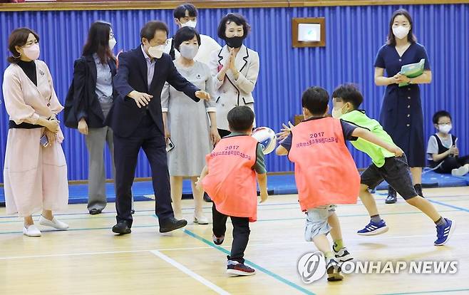 (서울=연합뉴스) 김도훈 기자 = 교육 문제 해결 방안을 찾기 위해 학교 현장 목소리 듣기에 나선 조희연 서울시 교육감이 29일 서울 동작초등학교를 방문해 방과후학교로 농구 활동하는 아이들을 바라보고 있다.