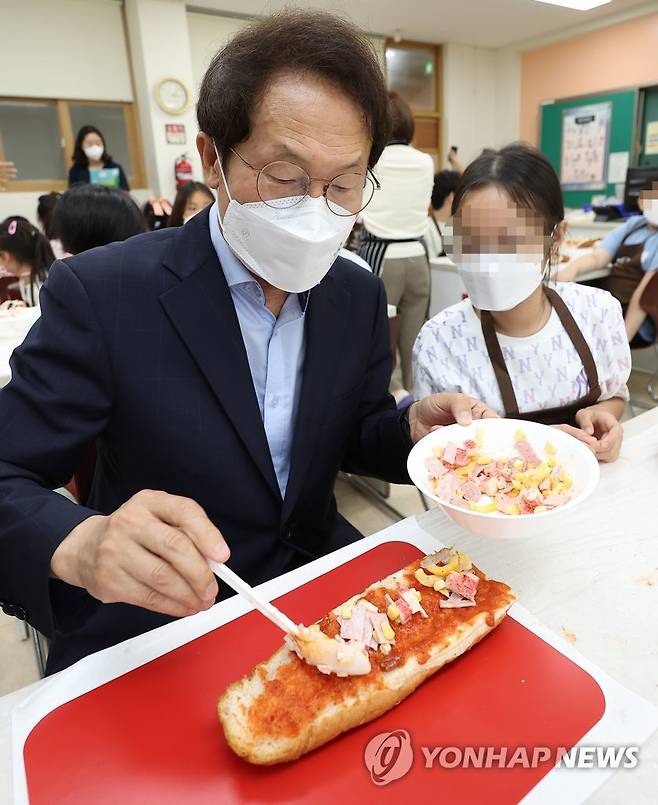 (서울=연합뉴스) 김도훈 기자 = 교육 문제 해결 방안을 찾기 위해 학교 현장 목소리 듣기에 나선 조희연 서울시 교육감이 29일 서울 동작초등학교를 방문해 방과후학교로 제과제빵 교실을 찾아 학생들과 피자 바게트를 만들고 있다.
