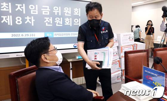 (세종=뉴스1) 김기남 기자 = 29일 오후 정부세종청사 최저임금위원회 회의실에서 속개된 제8차 전원회의에 앞서 정문주 근로자위원(오른쪽)과 이대희 특별위원이 이야기를 나누고 있다.2022.6.29/뉴스1