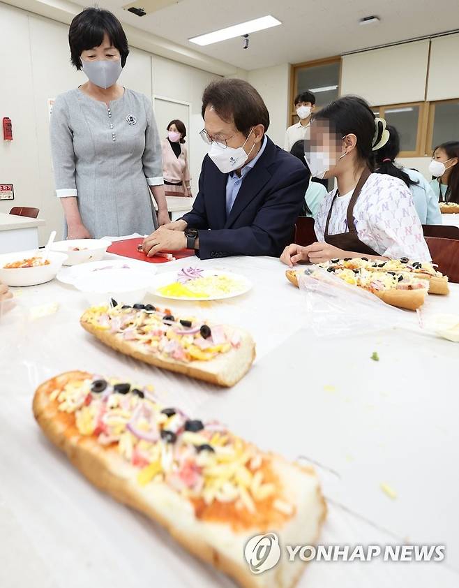 (서울=연합뉴스) 김도훈 기자 = 교육 문제 해결 방안을 찾기 위해 학교 현장 목소리 듣기에 나선 조희연 서울시 교육감이 29일 서울 동작초등학교를 방문해 방과후학교로 제과제빵 교실을 찾아 학생들과 피자 바게트를 만들고 있다.