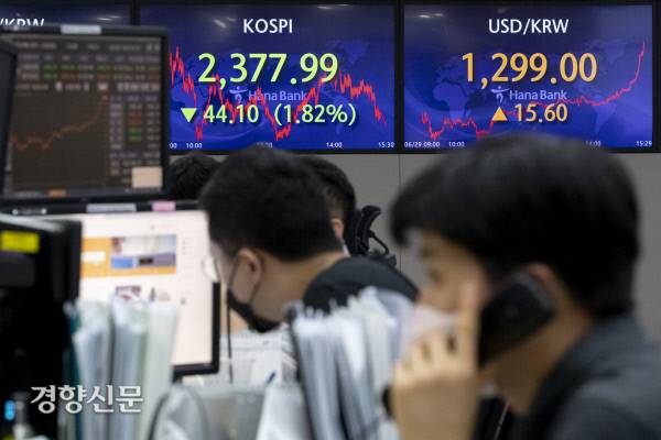 29일 서울 중구 하나은행 딜링룸에서 직원들이 업무를 보고 있다. 이날 코스피는 전장보다 1.82% 하락하며 2377.99로, 코스닥 지수는 전장보다 0.93% 하락한 762.35로 마감했다. 서울 외환시장에서 원·달러 환율은 전 거래일 대비 15.60원 오른 1299.0원으로 거래를 마쳤다.