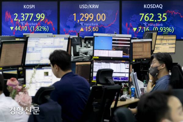 29일 서울 중구 하나은행 딜링룸에서 직원들이 업무를 보고 있다. 이날 코스피는 전장보다 1.82% 하락하며 2377.99로, 코스닥 지수는 전장보다 0.93% 하락한 762.35로 마감했다. 서울 외환시장에서 원·달러 환율은 전 거래일 대비 15.60원 오른 1299.0원으로 거래를 마쳤다.