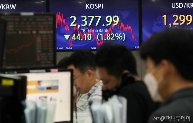 코스피가 전 거래일 대비 44.10포인트(1.82%) 내린 2377.99로 하락, 코스닥이 7.16포인트(0.93%) 내린 762.35로 하락 마감한 29일 서울 중구 명동 하나은행 딜링룸 전광판에 지수가 표시돼 있다.