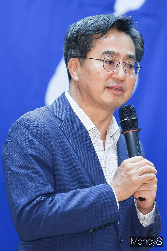 김동연 경기도지사 당선인이 29일 서울 여의도 국회 의원회관에서 열린 더불어민주당 6.1 지방선거 자치단체장 당선자 워크숍에서 인사말을 하고 있다.