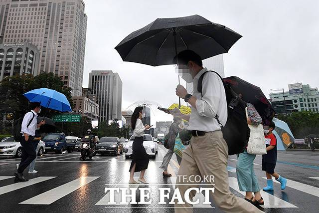 [더팩트ㅣ남용희 기자] 장마가 이어지며 전국적으로 장맛비가 내리는 29일 오후 서울 종로구 광화문 네거리 일대의 시민들이 우산을 쓴 채 발걸음을 재촉하고 있다.
