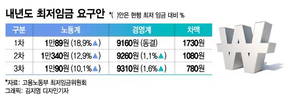 노동계와 경영계의 최저임금 간극은 최초 1730원에서 780원으로 줄었지만 입장차이는 여전하다. 업계 관계자는 "시간당 최저임금 1만원 이하로는 협상할 수 없다는 노동계와 9500원 이상은 받아들이기 어렵다는 경영계 입장이 팽팽하다"고 말했다. 취임위가 법정시한인 이날 자정까지 협의를 하지 못하면 표결로 내년도 최저임금을 결정하게 된다.