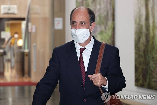 (서울=연합뉴스) 김승두 기자 = 토마스 오헤아 킨타나 유엔 북한인권특별보고관이 29일 오후 권영세 통일부 장관과 면담을 위해 청사로 들어서고 있다. 2022.6.29