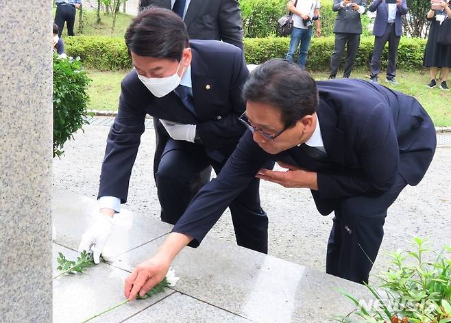 [인천=뉴시스] 김동영 기자 = 국민의힘 안철수 의원(왼쪽)이 29일 오후 인천 연수구 송도고등학교에서 열린 제20주기 故 윤영하 소령 추모식에서 윤 소령 흉상에 헌화를 하고 있다. 2022.06.29. dy0121@newsis.com
