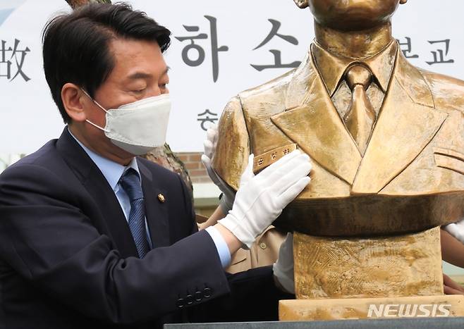 [인천=뉴시스] 김동영 기자 = 국민의힘 안철수 의원이 29일 오후 인천 연수구 송도고등학교에서 열린 제20주기 故 윤영하 소령 추모식에서 윤 소령 흉상에 빗물을 닦고 있다. 2022.06.29. dy0121@newsis.com